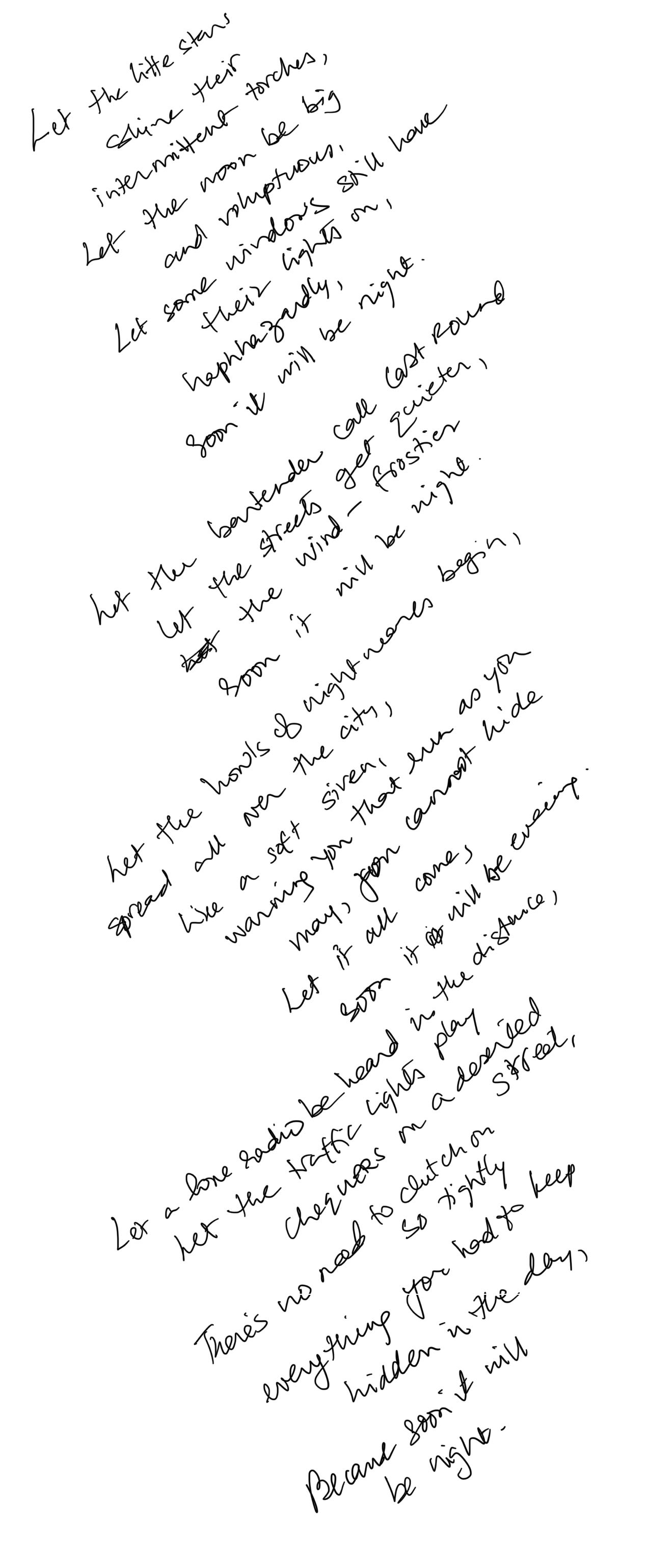 Let the little stars Shine their intermittent torches, Let the noon be big and voluptuous, Let some windows still have the lights on, Haphazardly, Soon it will be night. Let a bartender call the last round, Let the streets get quieter, The winds —frostier , Soon it will be night . Let the howls of the night begin, Spread all over the city Like a faint siren , Warning you— Run as you may, You can never hide , Let it all come, Soon it will be night. Let a lone radio be heard in the distance, Let the traffic lights play checkers on a deserted street , There’s no need to clutch on so tightly, Soon it will be night .